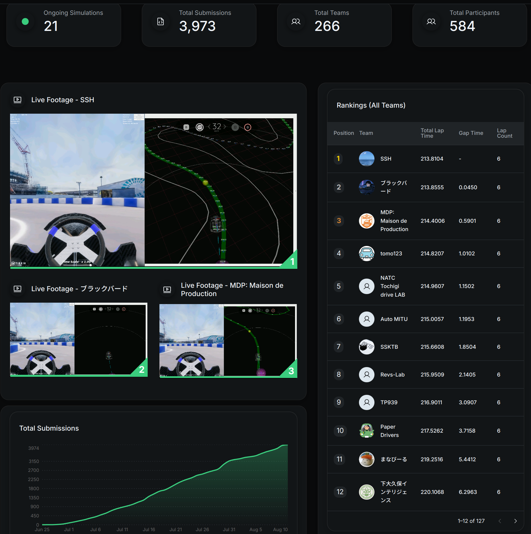 オンラインダッシュボードを通じてリアルタイムで順位変動を可視化しています。各チームのパフォーマンスや順位の推移を動的に表示することで、競技の展開を臨場感を持って観戦いただけます。このインタラクティブな仕組みにより、技術競技としての緊張感と観戦の魅力を両立させ、参加者・観覧者双方にとって充実した体験を提供しています。