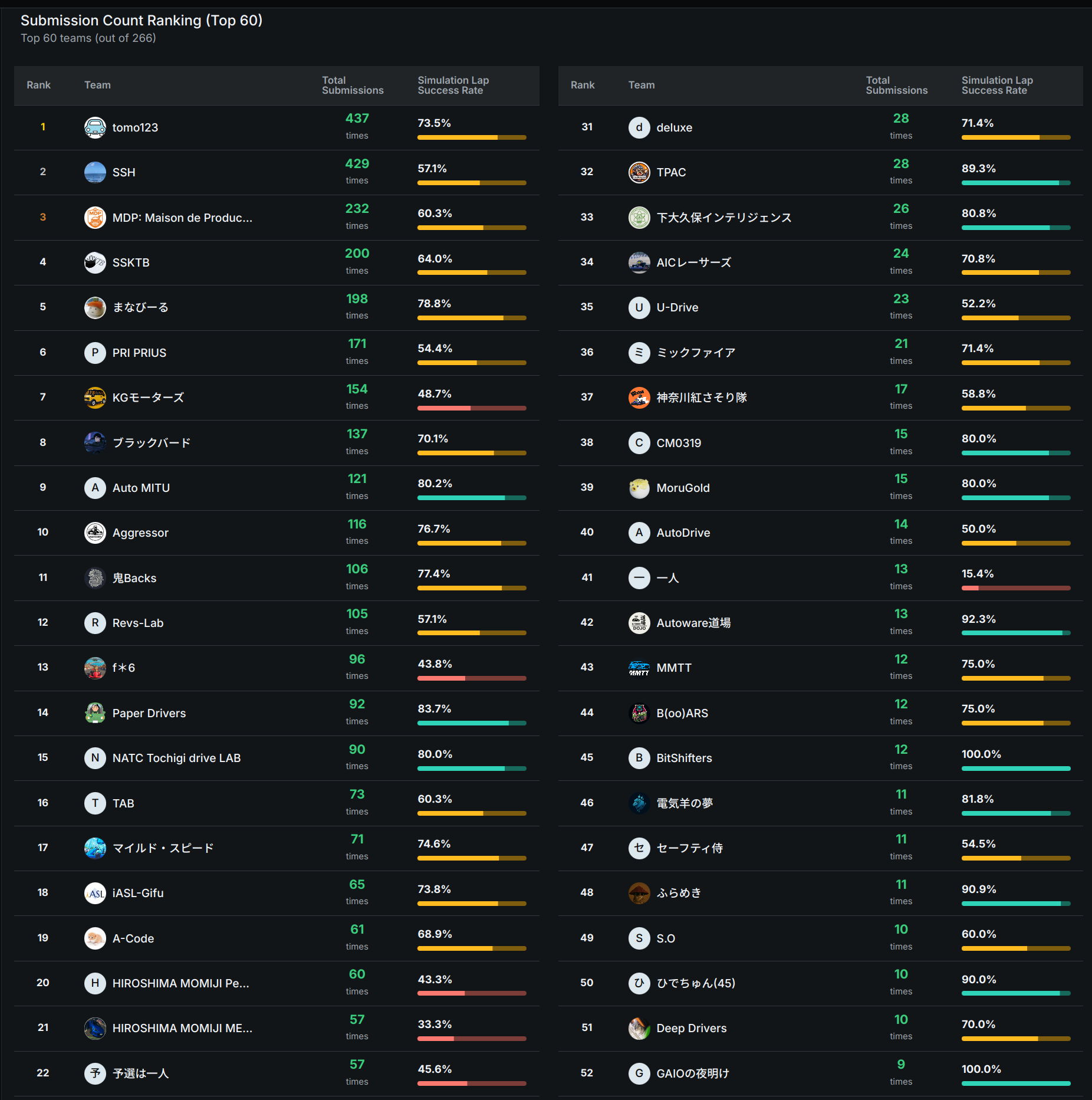 チームの提出回数やシミュレーション成功率といった各種メトリクスを可視化し、各チームの取り組みの過程を定量的に表現しています。単純な順位だけでなく、試行錯誤の回数や改善の軌跡など、技術開発における努力のプロセスを明確に示すことで、優勝に至るまでの技術的な挑戦と成長のストーリーを浮かび上がらせています。これにより、観戦者は自身が共感できるチームを見つけ、より深い技術競技への理解と関心を持っていただけるよう設計しています。